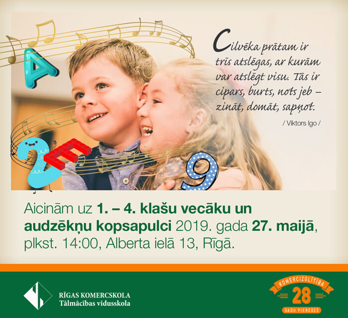 Aicinām uz 1.-4. klašu vecāku un audzēkņu kopsapulci 2019. gada 27. maijā, plkst. 14:00, Alberta ielā 13, Rīgā.