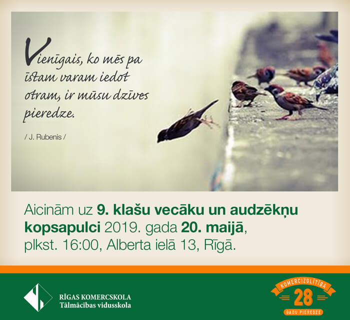 Aicinām uz 9. klašu vecāku un audzēkņu kopsapulci 2019. gada 20. maijā, plkst. 16:00, Alberta ielā 13, Rīgā.