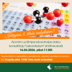 Aicinām Tālmācības vidusskolas “Rīgas Komercskola” 8.klases audzēkņus uz Ķīmijas laboratorijas...