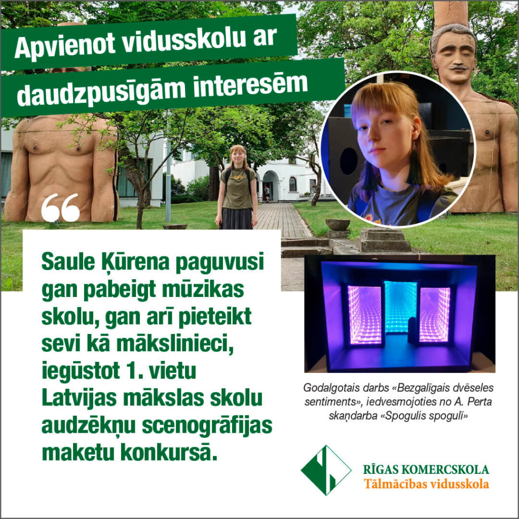 Tālmācības vidusskolas “Ŗīgas Komercskola” audzēkne Saule Ķūrena paguvusi gan pabeigt mūzikas skolu, gan arī pieteikt sevi kā mākslinieci, iegūstot 1. vietu Latvijas mākslas skolu audzēkņu scenogrāfijas maketu konkursā!
