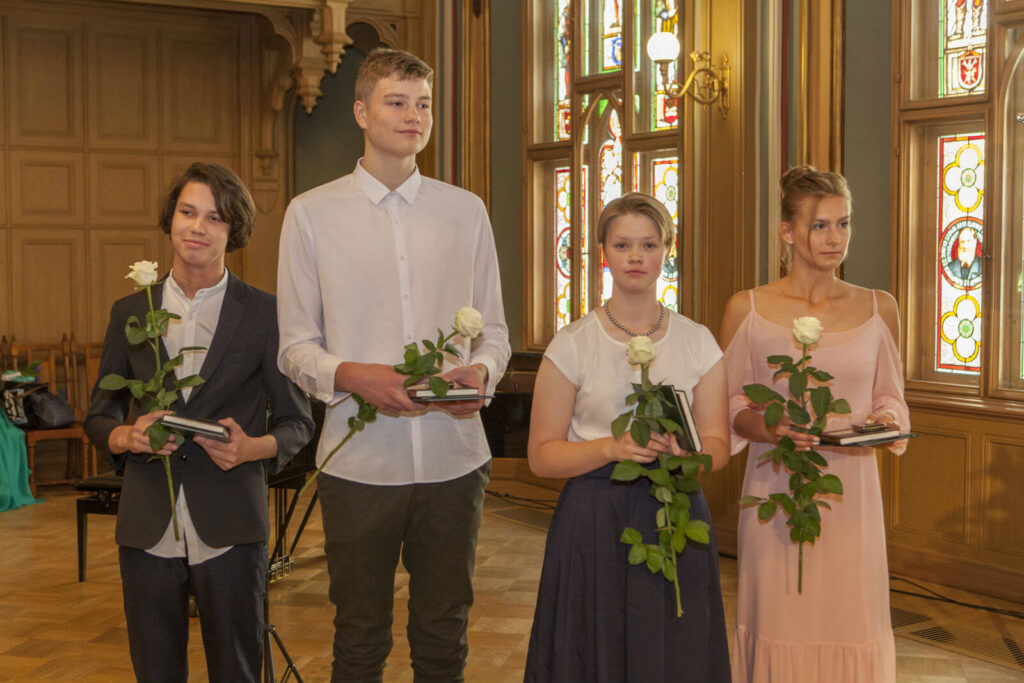 Tālmācības vidusskolas «Rīgas Komercskola» 9.klases absolventi Līva Grēta Balode, Beāte Muižniece, Krišs Helmanis, Jēkabs Vanags un Viesturs Laicāns saņēma Atzinības rakstu par apzinīgu attieksmi, labiem un teicamiem sasniegumiem mācību darbā.
