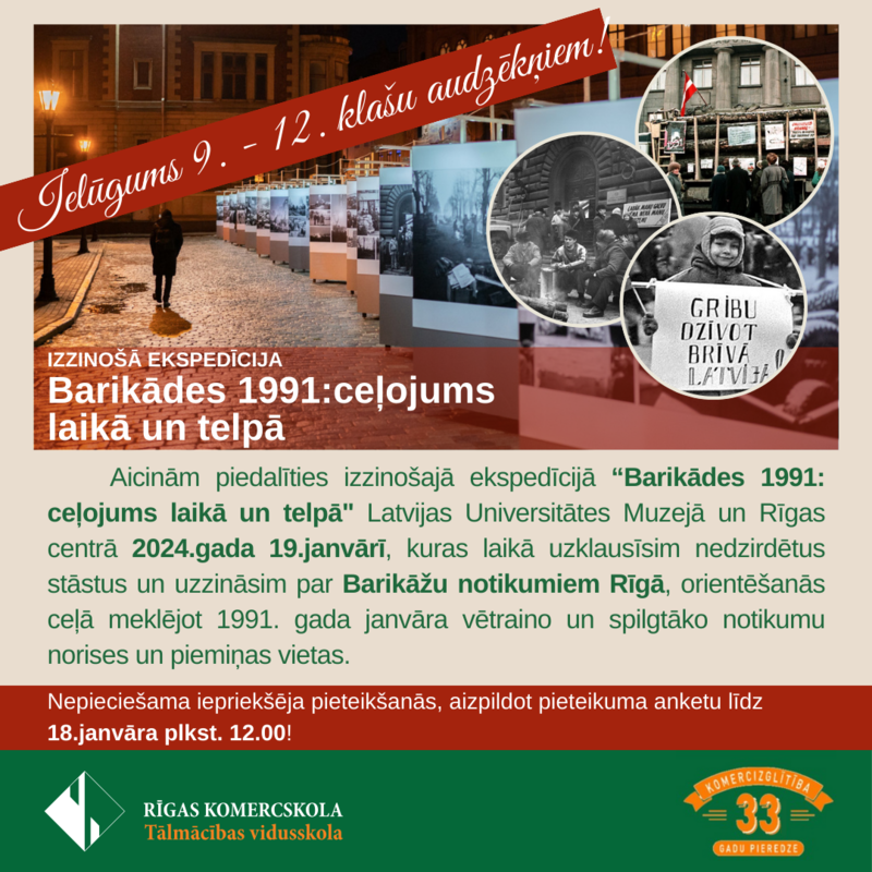 Mūsu, Tālmācības vidusskolas “Rīgas Komercskola”, 9.-12. klašu audzēkņi devās izzinošā ekspedīcijā “Barikādes 1991: ceļojums laikā un telpā” pa Rīgas centru, sadaloties komandās, orientējoties un meklējot kontrolpunktus – 1991. gada janvāra vētraino un spilgtāko notikumu norises un piemiņas vietas, kuras bija norādītas uzdevumu lapās.