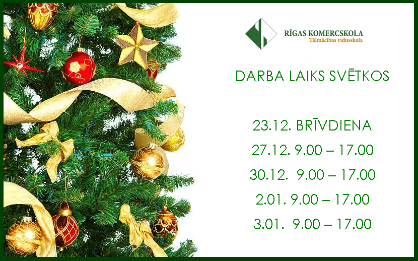23.12. – Brīvdiena24., 25. un 26. 12. – Brīvdienas27.12. – 9:00 – 17:0030.12. – 9:00 – 17:0031.12. – Brīvdiena2.01. – 9:00 – 17:003.01. – 9:00 – 17:00