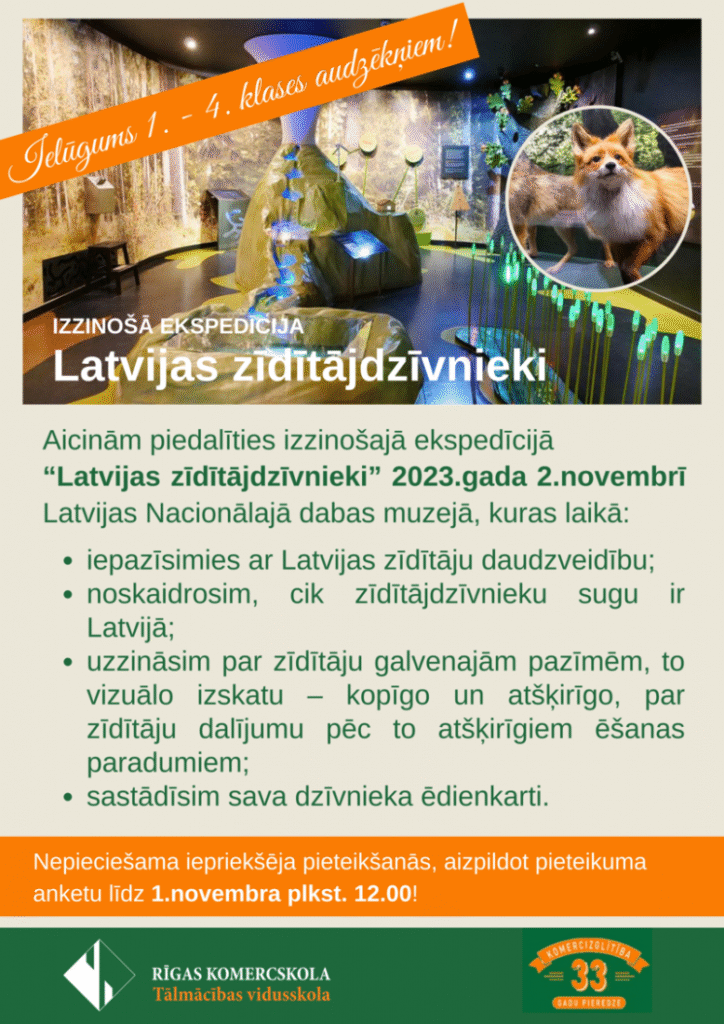 Mūsu, 1.-4. klases audzēkņi izzinošās ekspedīcijas “Latvijas zīdītājdzīvnieki” laikā Latvijas Nacionālā Dabas muzejā, darbojoties grupās, iepazina Latvijas dzīvniekus, to vizuālo izskatu, ēdienkarti, kopīgi iepazīstot zīdītāju dalījumu pēc to atšķirīgiem ēšanas paradumiem – plēsēji, zālēdāji, visēdāji un kukaiņēdāji, noskaidroja, cik zīdītājdzīvnieku sugu ir Latvijā. Audzēkņi zināšanas apguva ar prieku, gūstot izpratni par daudzveidīgo Latvijas zīdītājdzīvnieku pasauli, pilnveidojot prasmi sadarboties.