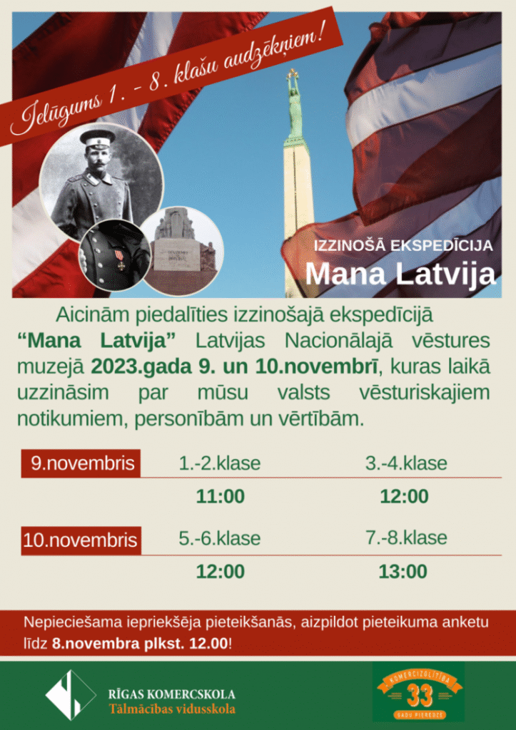 Mūsu, Tālmācības vidusskolas “Rīgas Komercskola”, 1.-8. klases audzēkņi kopā ar pedagogiem piedalījās izzinošajā ekspedīcijā “Mana Latvija” Latvijas Nacionālajā vēstures muzejā, kuras laikā iepazina mūsu valsts vēstures notikumus, personības un vērtības.