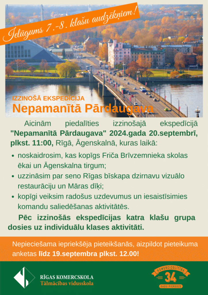 Mūsu, Tālmācības vidusskolas “Rīgas Komercskola”, 7. un 8.klašu audzēkņi devās izzinošā ekspedīcijā “Nepamanītā Pārdaugava”, lai pētītu ievērojamā Rīgas pilsētas arhitekta Reinholda Georga Šmēlinga arhitektūras stila raksturīgās iezīmes, piedalītos foto orientēšanās stafetēs, kopīgi veiktu savstarpējās uzticēšanās uzdevumus.