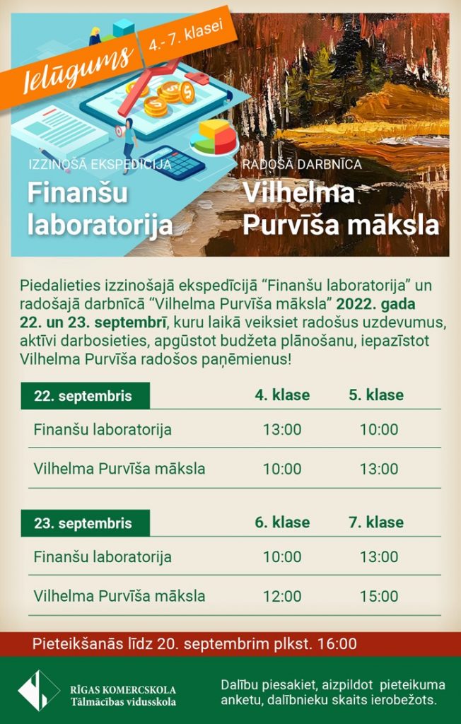 Piedalieties izzinošajā ekspedīcijā “Finanšu laboratorija” un radošajā darbnīcā “Vilhelma Purvīša māksla”, kuru laikā veiksiet radošus uzdevumus, aktīvi darbosieties, apgūstot budžeta plānošanu, iepazīstot Vilhelma Purvīša radošos paņēmienus!