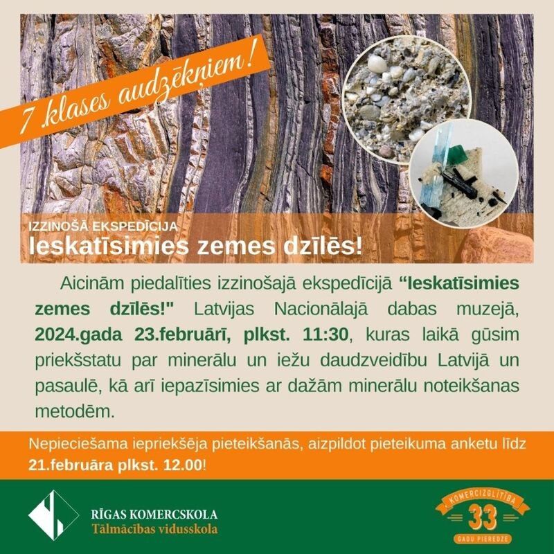 Mūsu, Tālmācības vidusskolas “Rīgas Komercskola”, 7.klases audzēkņi devās izzinošajā ekspedīcijā uz Latvijas Nacionālo dabas muzeju, lai gūtu priekšstatu par minerālu un iežu daudzveidību Latvijā un pasaulē, kā arī iepazītos ar dažādām minerālu noteikšanas metodēm.