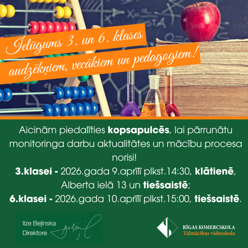 Aicinām Tālmācības vidusskolas “Rīgas Komercskola” 3. un 6.klases audzēkņus, vecākus un pedagogus piedalīties kopsapulcēs, lai pārrunātu monitoringa darbu aktualitātes un mācību procesa norisi!