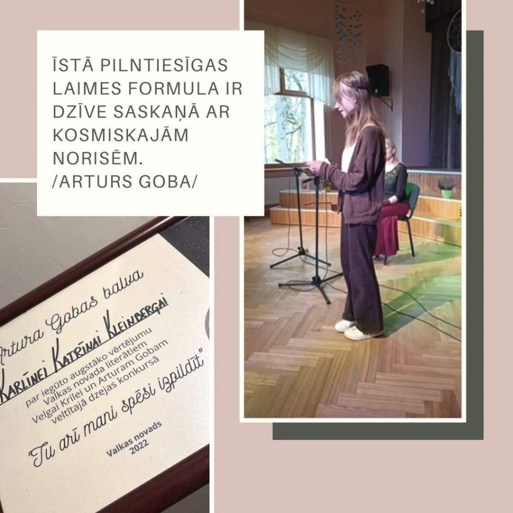 Apsveicam mūsu 10. klases audzēkni Karlīni Katrīni Kleinbergu par iegūto augstāko vērtējumu Valkas novada literātiem Velgai Krilei un Arturam Gobam veltītajā dzejas konkursā “Tu arī mani spēsi izpildīt”!