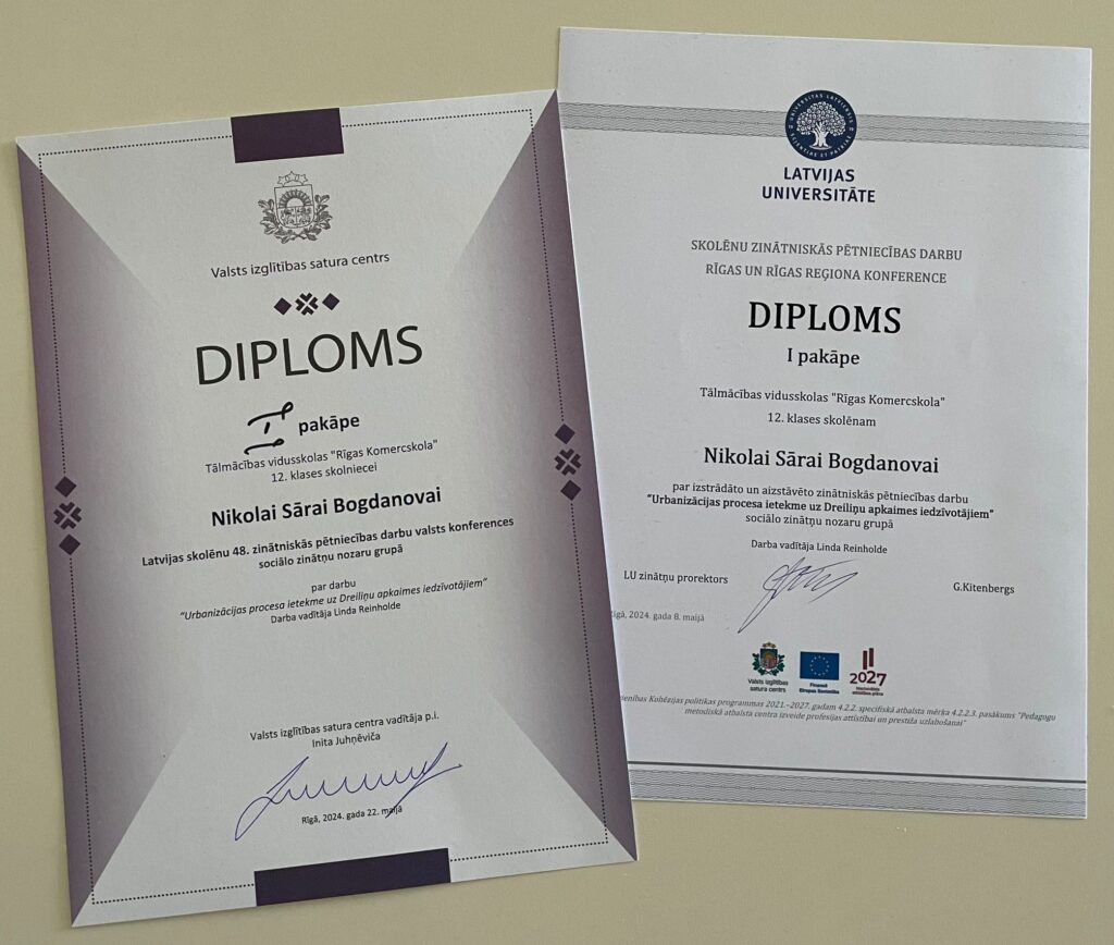 Mūsu, Tālmācības vidusskolas “Rīgas Komercskola” 12.klases audzēkne Nikola Sāra Bogdanova izstrādāja zinātniski pētniecisko darbu sociālo zinātņu nozaru grupā par urbanizacijas procesa ietekmi uz Dreiliņu iedzīvotājiem un izcili to 27. aprīlī, tiešsaistē, prezentēja Latvijas skolēnu 48. zinātniskās pētniecības darbu konferencē Rīgas un Rīgas reģionā, iegūstot augstāko novērtējumu I. pakāpi.