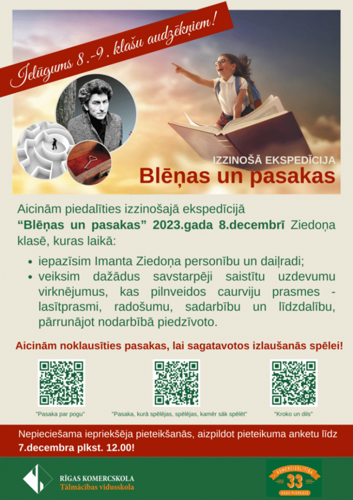 Mūsu, Tālmācības vidusskolas “Rīgas Komercskola”, 8. un 9.klašu audzēkņi piedalījās “Ziedoņa klases” organizētā aizraujošā piedzīvojuma nodarbībā “Blēņas un pasakas”, papildinot un nostiprinot zināšanas un kultūras izpratni par Imanta Ziedoņa personību un daiļradi, akcentējot rakstnieka vērtības.