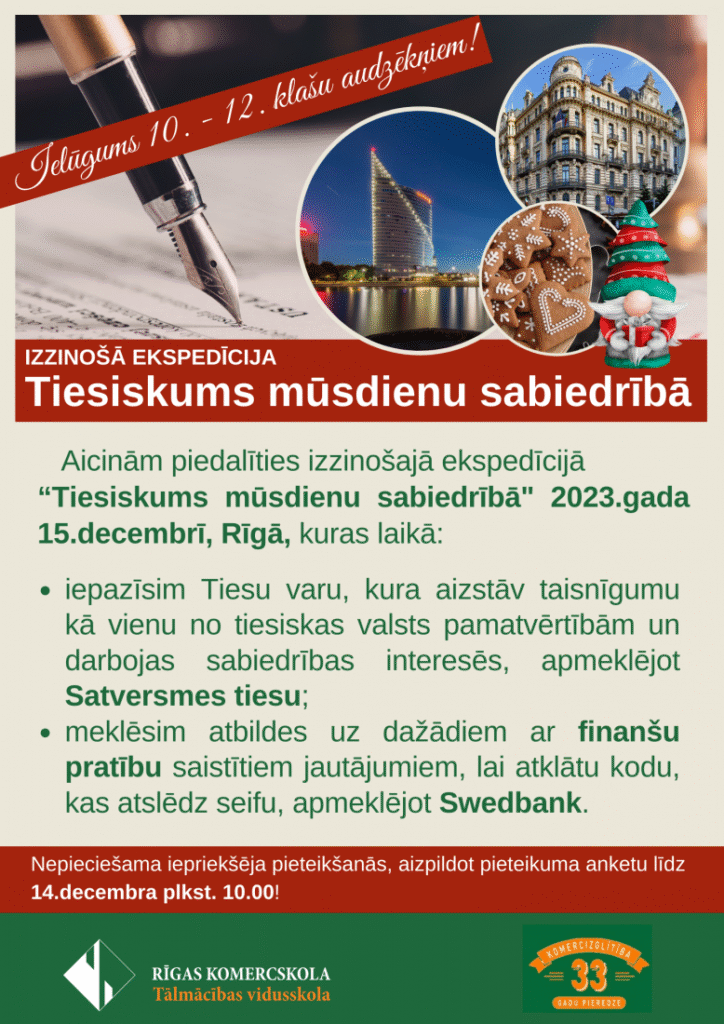 Mūsu, Tālmācības vidusskolas “Rīgas Komercskola”, 10.-12.klašu audzēkņi piedalījās praktiskā mācību stundā Satversmes tiesā ar mērķi iepazīt Tiesu varu, kura aizstāv taisnīgumu kā vienu no tiesiskas valsts pamatvērtībām un darbojas sabiedrības interesēs.