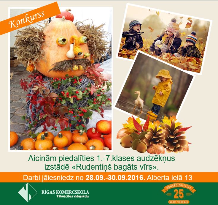 Tālmācības vidusskola «Rīgas Komercskola» aicina ikvienu savu 1.-7. klases audzēkni piedalīties krāsainā rudens konkursā «Rudentiņš bagāts vīrs»!