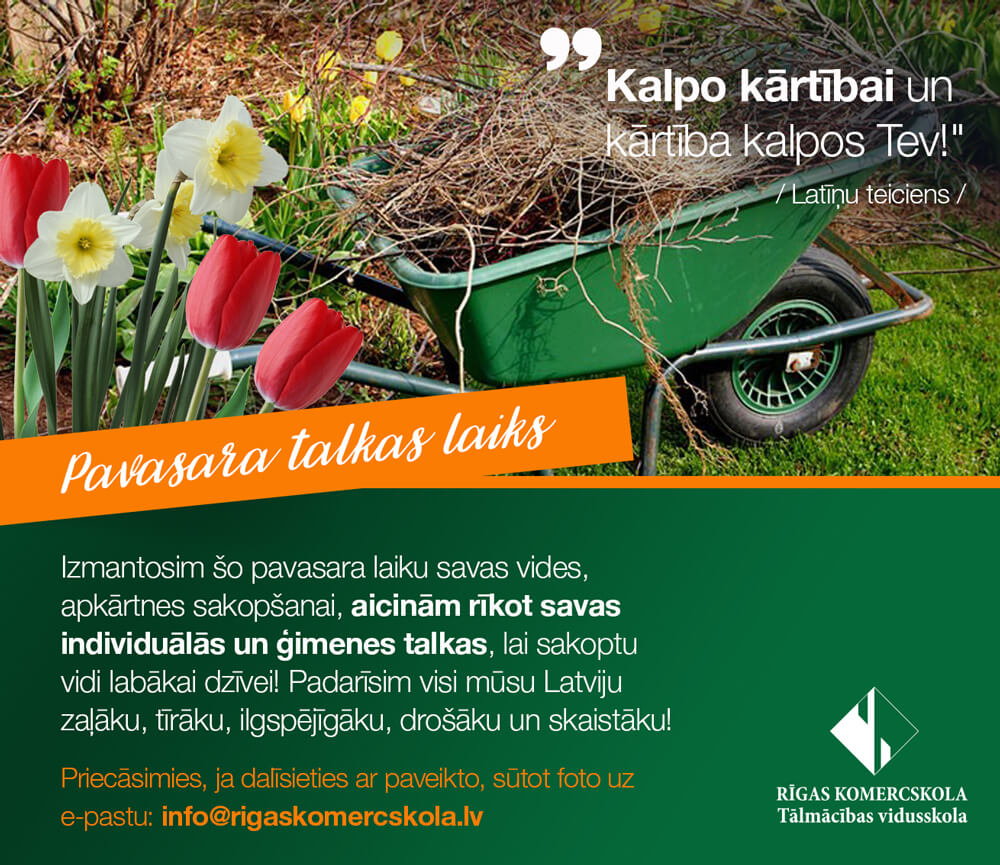 Izmantosim šo pavasara laiku savas vides, apkārtnes sakopšanai, aicinām rīkot savas individuālās un ģimenes talkas, lai sakoptu vidi labākai dzīvai!
