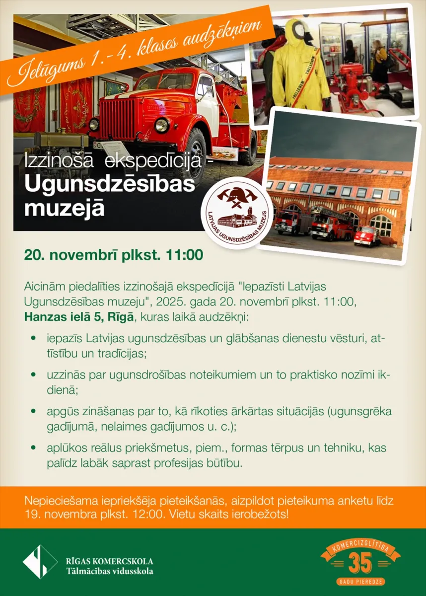 Mūsu, 1.-4. klases audzēkņi izzinošajā ekspedīcijā “Iepazīsti Latvijas Ugunsdzēsības muzeju” papildināja zināšanas par to, kā rīkoties ārkārtas situācijās: ugunsgrēka gadījumā, nelaimes gadījumos, pārrunājot drošību svētku laikā, ceļojumos, dodoties uz mežu, negaisa, vētras, plūdu laikā, bīstamu ķīmisko vielu noplūdes un radiācijas avārijas situācijās. Audzēkņi iepazina Latvijas ugunsdzēsības un glābšanas dienestu vēsturi, tradīcijas, aplūkojot formas tērpus, tehniku, kas palīdzēja labāk izprast profesijas būtību.