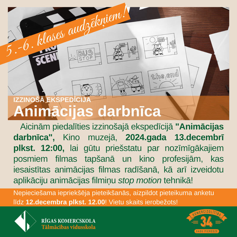 Mūsu, Tālmācības vidusskolas “Rīgas Komercskola”, 5.-6.klašu audzēkņi piedalījās izzinošajā ekspedīcijā “Animācijas darbnīca” Kino muzejā un veidoja aplikāciju animācijas filmiņu stop motion tehnikā. Audzēkņiem bija iespēja iepazīties ar nozīmīgākajiem posmiem filmas tapšanā, kā arī kino profesijām, kas iesaistītas animācijas filmas radīšanā.