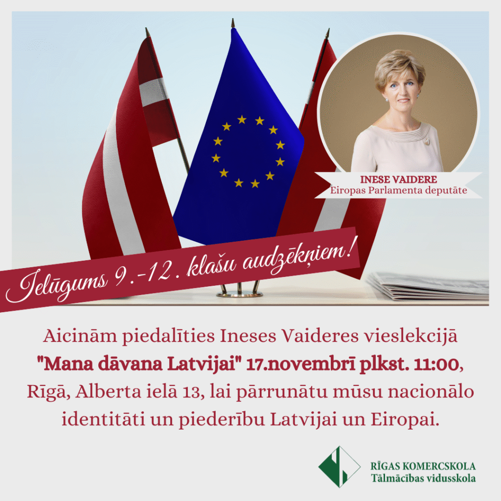 Mūsu, Tālmācības vidusskolas “Rīgas Komercskola”, 9.-12. klases audzēkņiem bija iepēja tikties vieslekcijā “Mana dāvana Latvijai” ar Eiropas Parlamenta deputāti Inesi Vaideri, kas jauniešus informēja par darbu Eiropas Parlamentā, sniedzot atbildes uz jauniešu interesējošiem jautājumiem – par drošības situāciju Eiropā, klimata izmaiņām un zaļo kursu.